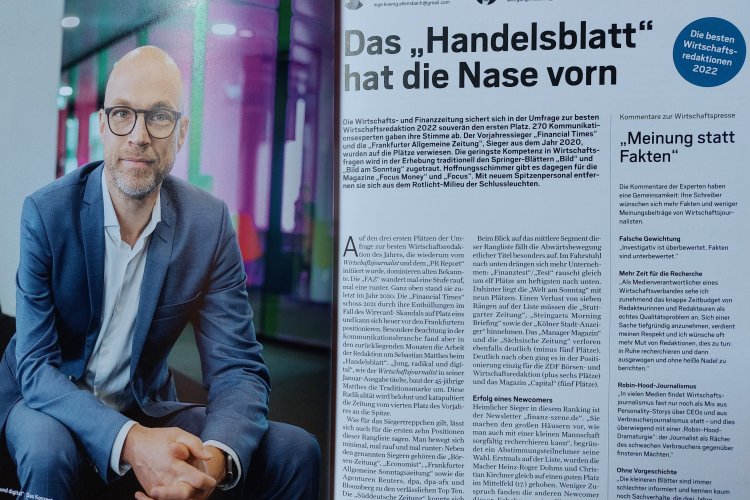 „Wirtschaftsjournalist:in“ könnte besser auf diesen Knochenjob hinweisen, den Sebastian Matthes zu vergeben hat. Im vergangenen Jahr war die Düsseldorfer Redaktion von diesem Magazin zur besten Wirtschaftsredaktion 2022 gewählt worden.