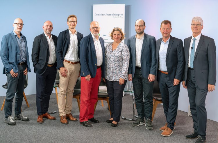 Laudatoren waren (Foto von links): Tobias Schwab (Ressortleiter Wirtschaft, Frankfurter Rundschau), Prof. Reint E. Gropp, Ph.D. (Präsident, Leibniz-Institut für Wirtschaftsforschung Halle), Sebastian Reimann (Chefredakteur, DVZ Deutsche Verkehrs-Zeitung), Claus Döring (ehem. Chefredakteur, Börsen-Zeitung), Sabine Wollrab (Chefredakteurin, Reuters), Niklas Wirminghaus (Leiter Digital, Capital), Ulric Papendick (Geschäftsführender Direktor, Kölner Journalistenschule), Volker Northoff (Kurator, Deutscher Journalistenpreis).